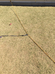 それを柵と柵に繋いで結びます。結べる場所の関係上、正面から見て斜めにロープを張りました。