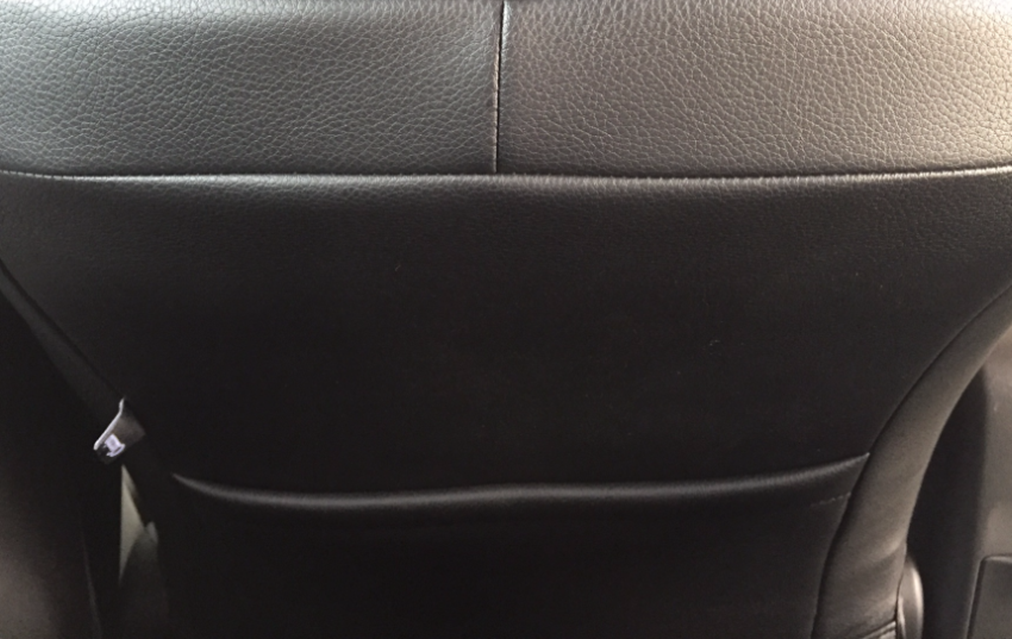 シート背面の写真。背面にはポケットが付いており、カバーのフィッティングの際に強く引っ張ったりしたが作りが頑丈なので、破れたり伸びたりといったこともなかった。