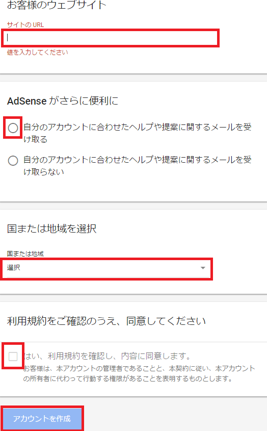 すると下記の画面になるので、【サイトのURL】→【自分のアカウントに~~を受け取る】にチェック→【国または地域】で日本を選択→【規約を読んで同意】チェック→【アカウントを作成】でOKです。次に進みます。