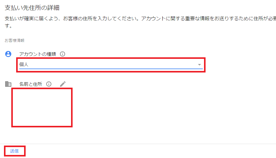再び画面が切り替わるので【アカウントの種類】を個人にします。続いて【名前と住所】を入力してください。