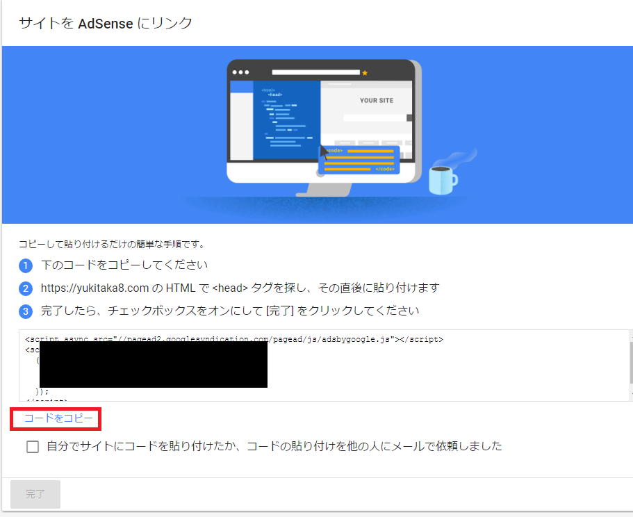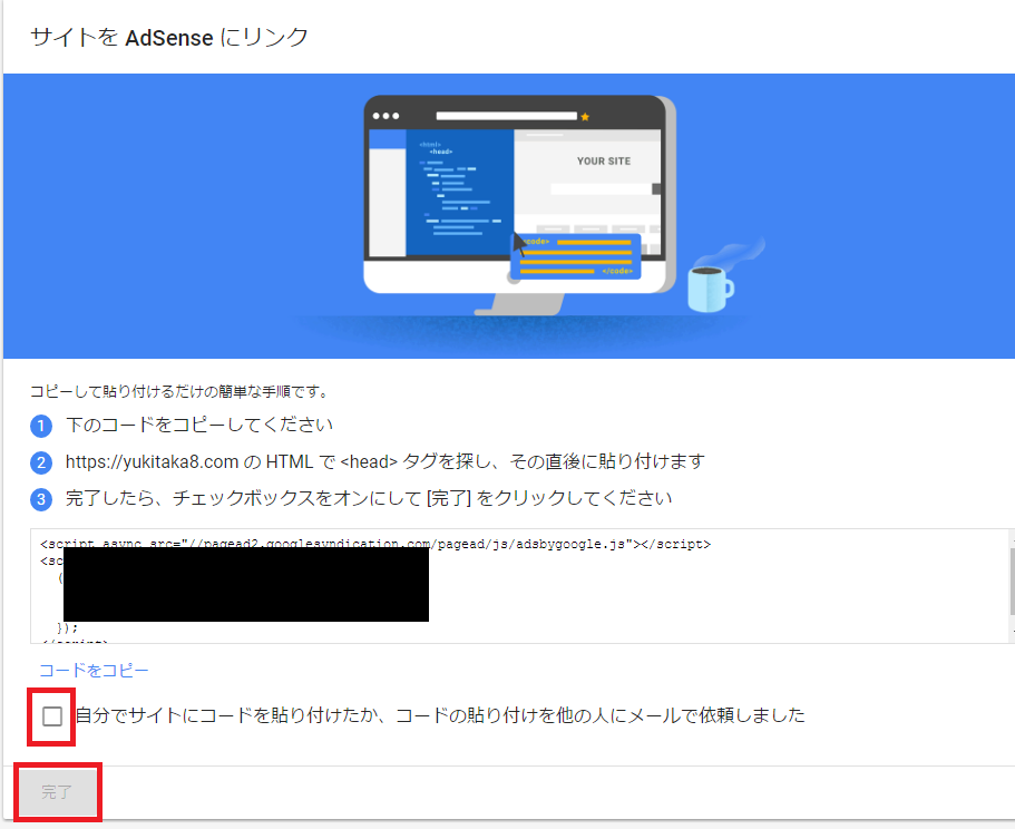 コードを貼りつけたら再びアドセンスのサイトへ戻ります。下記の画像のチェック欄にチェックを入れ、完了をクリックしてください。