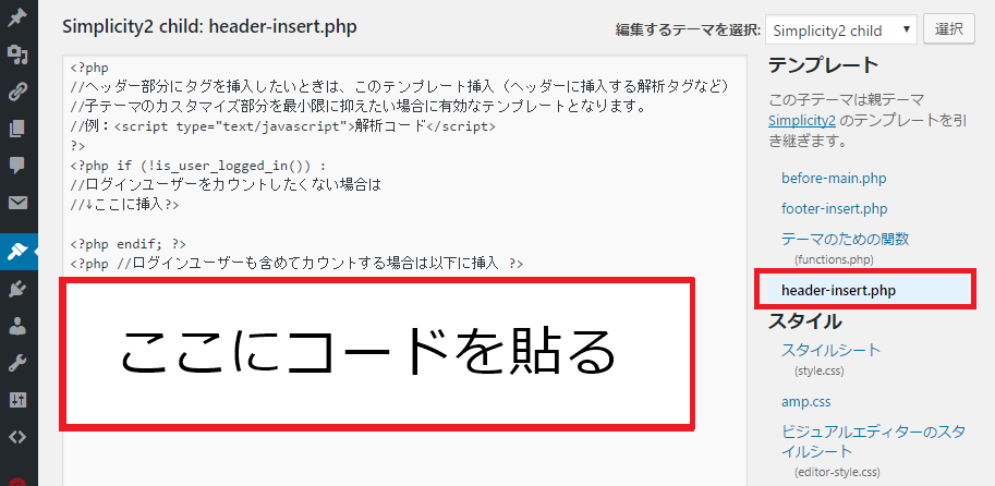 simplicity2環境などの一部のテーマはheader-insert.phpといったコードを貼り付けるスペースがあります。