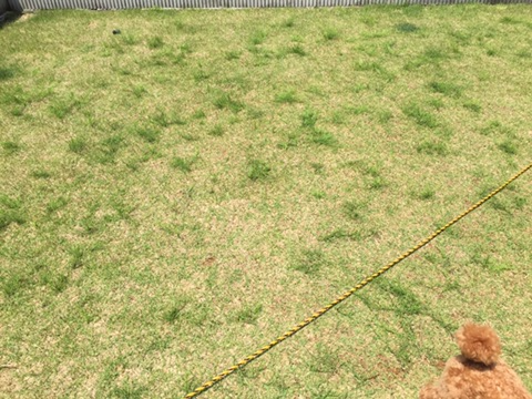 深緑色の植物全部スギナですよ。明らかに去年よりスギナの割合が増えてるし、このままだと芝生育ててるのかスギナ育ててるのか分からなくなる。