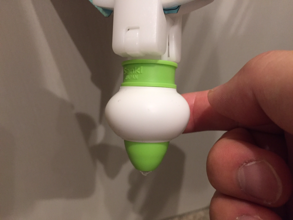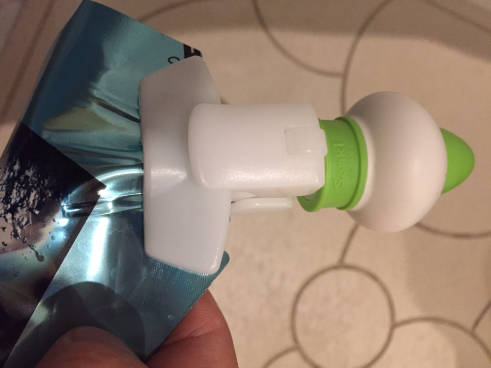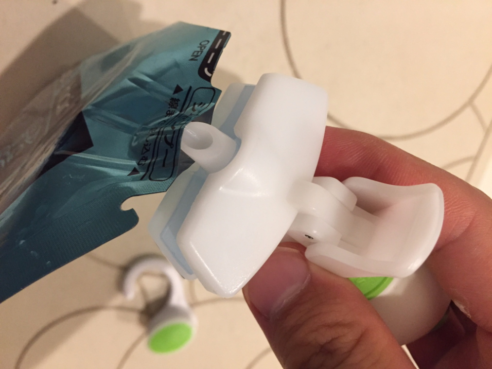 詰め替えパックの先端部分を詰め替えそのままの先端が差し込めるようにハサミでカットします。詰め替えパックによっては、手でちぎるだけで差し込めると思いますが、今回私が取り付けた詰め替えパックは手でちぎるだけだと穴が小さくて差し込めませんでした。