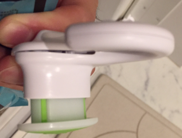 続いてフックの部分です。ロックする部分を引っ張って、隙間に詰め替えパックの後ろ(先ほど差し込んだ所の対極部分)を差し込んで閉じます。
