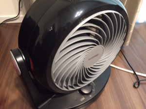 サーキュレーターをエアコンの真下に設置する事で冷気を循環させて部屋の温度を均一にすることが狙いです。