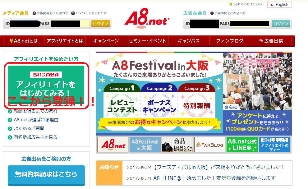 まずは下記のA8ネット公式サイトへアクセスし会員登録(無料)を行いましょう。