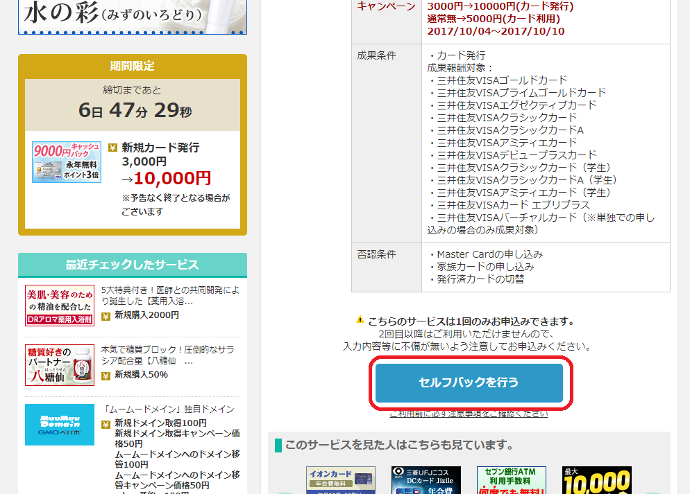 手軽に10000円代の高額報酬が得られるクレジットカードが特におすすめなのですが、カードによっては期間限定でキャッシュバックやポイントのサービス、セルフバック金額の増額を行っている事があるのでそのタイミングを狙って契約するのがベストです。
