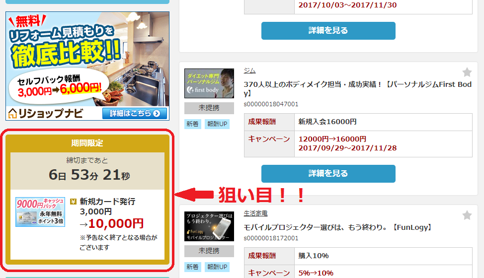 人気が高く一時的に報酬がアップしている商品はこのように大々的に紹介されていたりするので、このような商品を狙っていくとセルフバックした直後に報酬アップ!なんて事態にならなくて済みます。